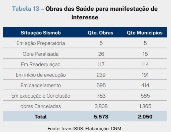 Segundo a CNM, as obras que serão repactuadas e que foram confirmadas pelos municípios que estão paradas são, além de UBS, academias da saúde, CER e UPA e incluem também ações nas redes Cegonha e Neonatal e em Centros Especializados em Reabilitação e oficinas ortopédicas.