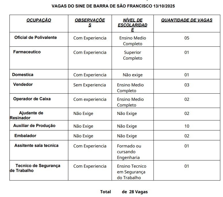 A Agência do Sine de Barra de São Francisco atualizou, nesta segunda-feira (13), para 28 o número de vagas de empregos formais no município. As oportunidades incluem funções como doméstica, operador de caixa, embalador, farmacêutico, entre outras (confira a lista completa ao final da matéria).