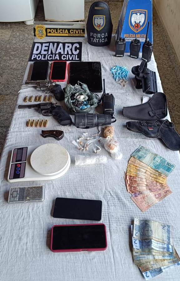 Na ação, sete pessoas foram presas, quatro delas mediante mandado de prisão, além disso, foram apreendidos armas e munições, rádios comunicadores, drogas e outros matérias que eram utilizados na preparação e embalo das drogas.