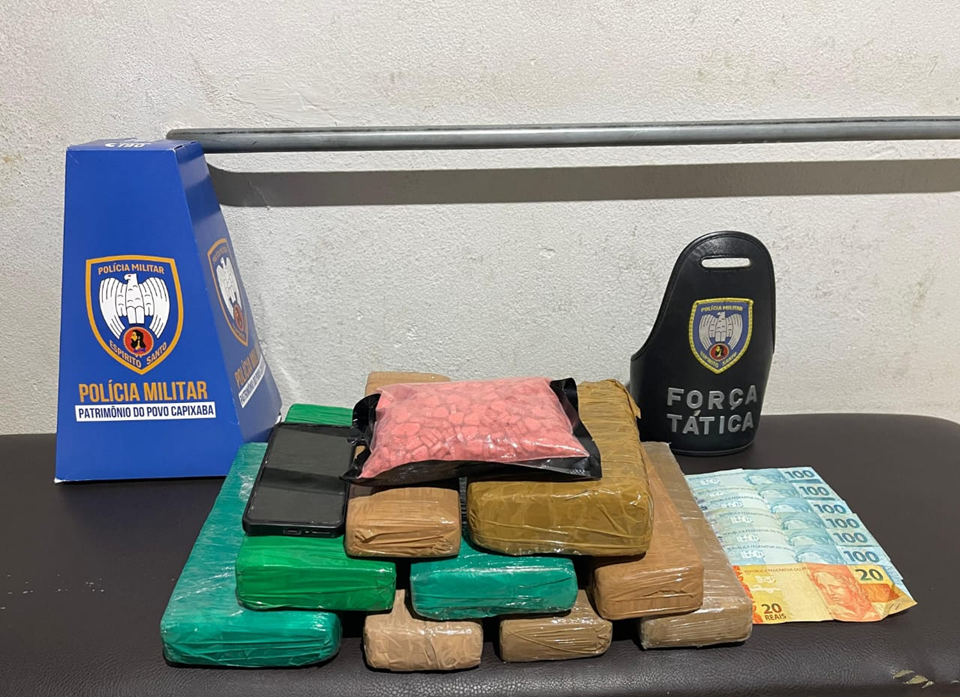 Com apoio da guarnição de Serviço Ordinário, a equipe intensificou as buscas e localizou o veículo momentos depois, realizando a abordagem. Durante a vistoria, foi encontrada uma bolsa vermelha contendo sete tabletes de maconha, pesando aproximadamente 7,873 kg, 523 g de ecstasy, além de um aparelho celular da marca Xiaomi e R$ 620,00 em espécie.
