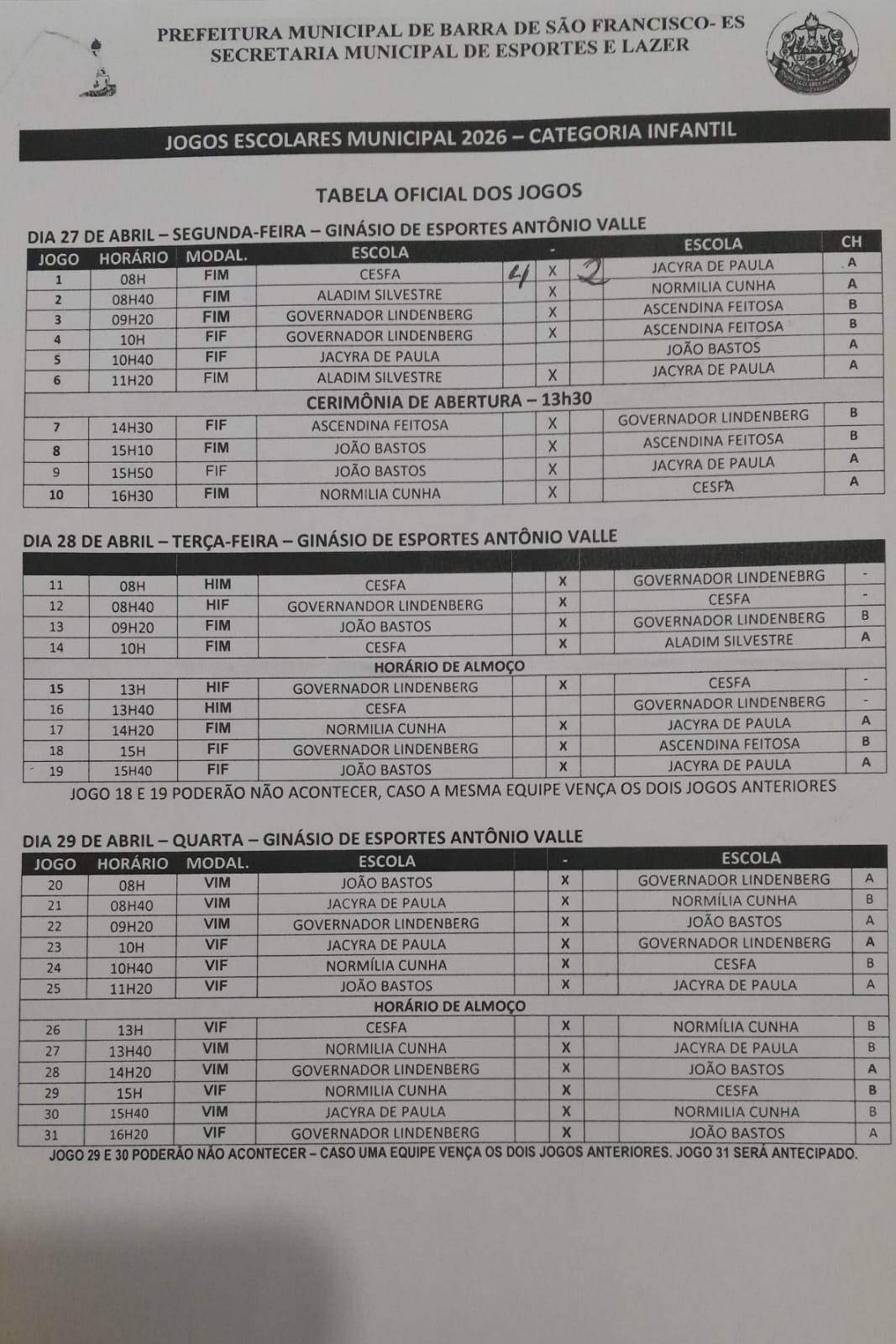 Confira a tabela completa dos Jogos Escolares 2026 – Fase Municipal.