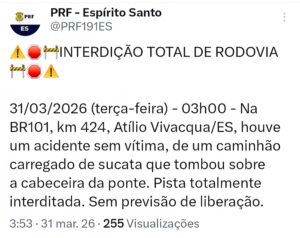 Um acidente na madrugada desta terça-feira (31.03) deixou, totalmente, interditada a BR 101 no município de Atílio Vivacqua, no Sul do Espírito Santo. Não há vítimas e nem previsão de liberação.