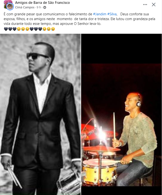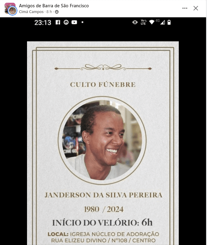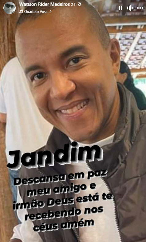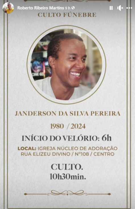 Faleceu na noite desta quarta-feira (3), no Hospital Dr. Alceu Melgaço Filho, em Barra de São Francisco, o Guerreiro, Pai de Família, Esposo e músico Janderson da Silva Pereira, o Jandim, de 43 anos.