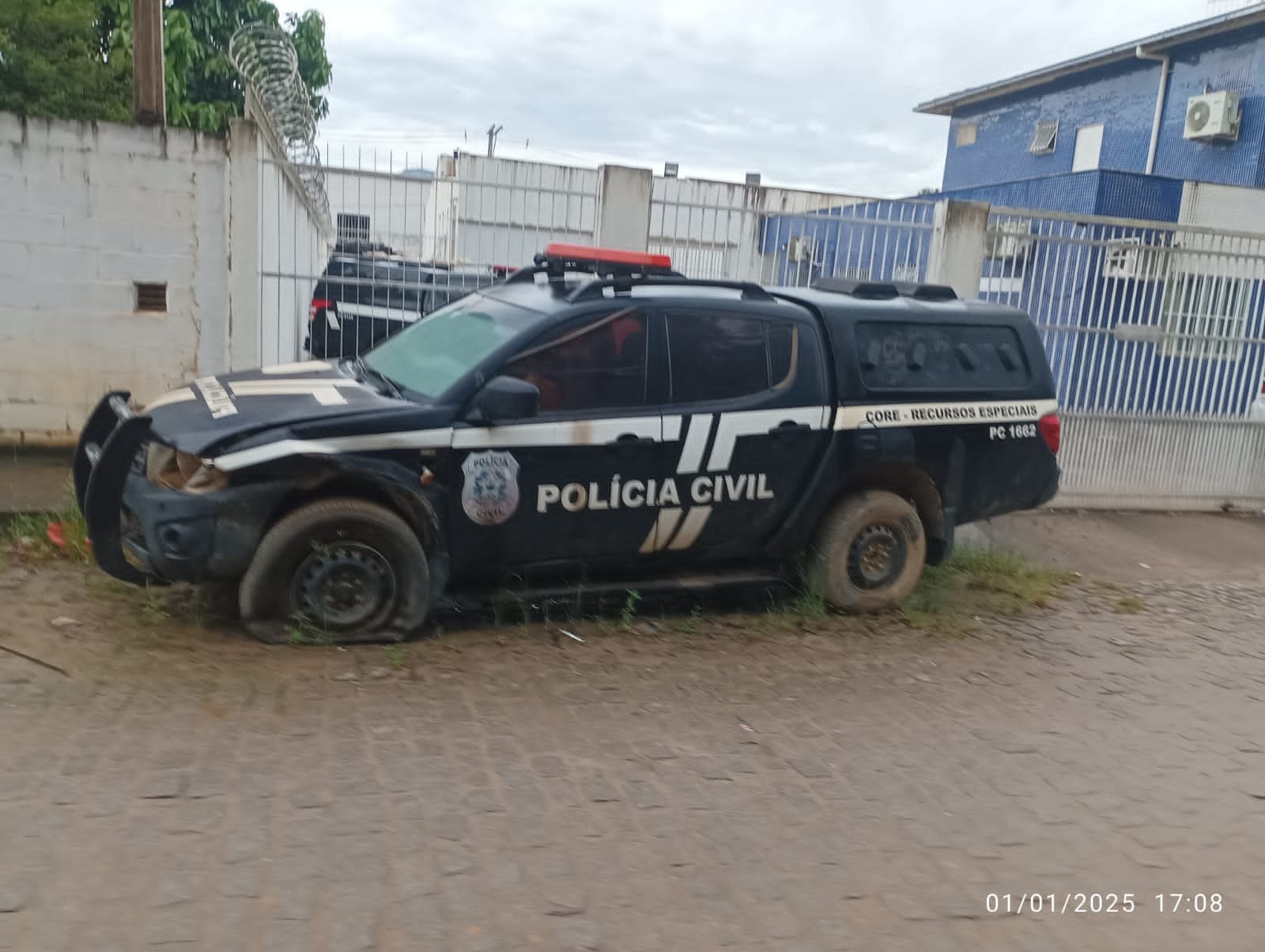 Embora as festividades de virada do ano, na Praça Arlindo Pinto, tenham transcorrido sem ocorrências, enquanto era realizada a queima de fogos de artifício (sem som) no Centro da cidade, uma viatura acidentada a estacionada em frente à Delegacia Regional, no bairro Novabarra, foi vandalizada.
