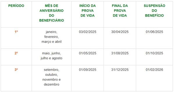 O prazo para os aposentados e pensionistas se recadastrarem é baseado no mês de seu aniversário, conforme tabela a seguir.