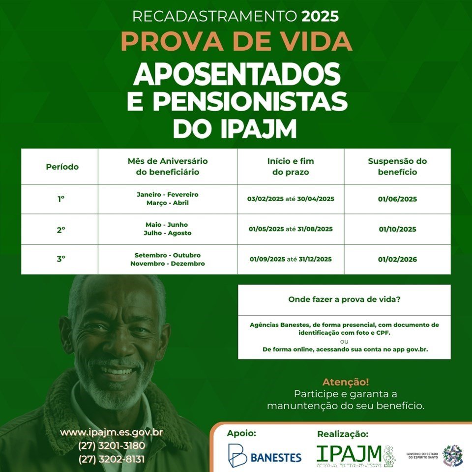 O Instituto de Previdência do Estado (IPAJM) informa que os aposentados e pensionistas que fazem aniversário entre os meses de janeiro e abril e ainda não realizaram a prova de vida devem regularizar a situação até o dia 30 de maio de 2025.