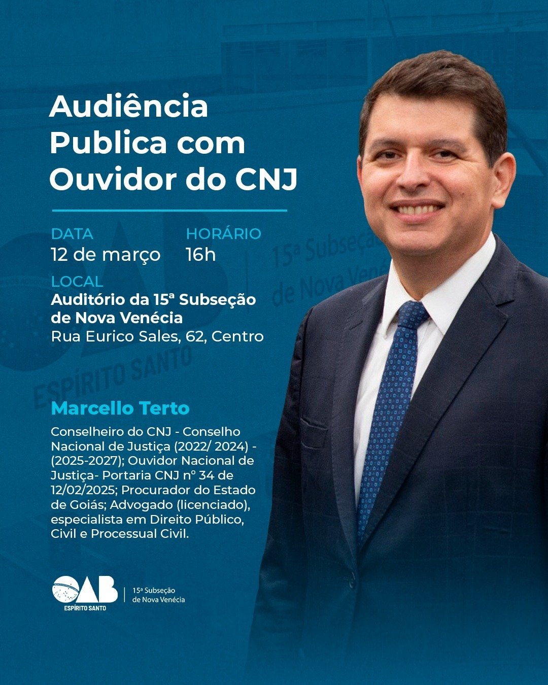 A 15ª Subseção da Ordem dos Advogados do Brasil, em Nova Venécia, promove, nesta quinta-feira (12), uma audiência pública com o ouvidor nacional de Justiça e conselheiro do Conselho Nacional de Justiça (CNJ), Marcello Terto. O encontro será realizado às 16h, no auditório da 15ª Subseção da OAB, localizado na Rua Eurico Sales, no Centro de Nova Venécia.