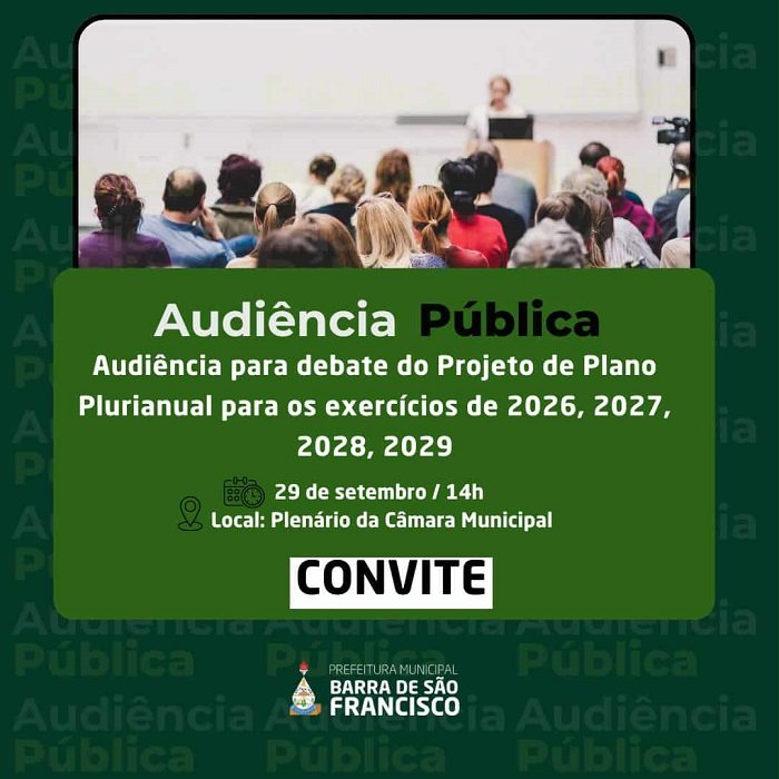 A Prefeitura Municipal de Barra de São Francisco convida toda a população francisquense para participar da audiência pública do Plano Plurianual (PPA) 2026-2029, que será realizada no próximo dia 29 de setembro, às 14 horas, no Plenário da Câmara Municipal de Vereadores, no bairro Irmãos Fernandes.