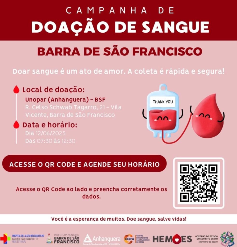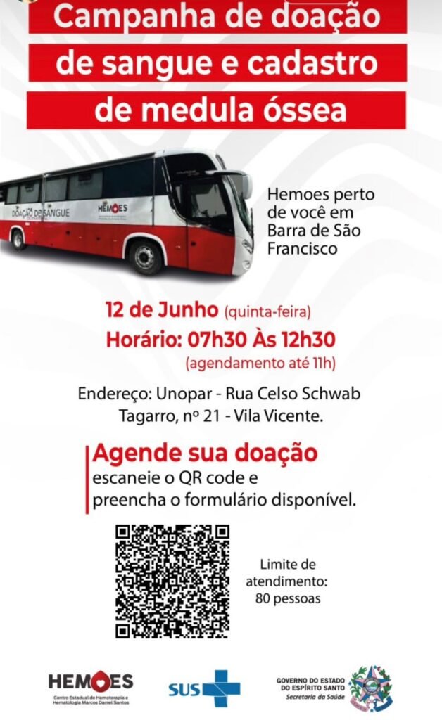 A cidade de Barra de São Francisco será ponto de coleta da campanha estadual “Compartilhe Vida, Doe Sangue”, promovida pelo Centro de Hemoterapia e Hematologia do Espírito Santo (Hemoes), no próximo dia 12 de junho, quinta-feira, das 07h30 às 12h30, na unidade da Unopar (Anhanguera), localizada na Rua Celso Schwab Tagarro, nº 21, Vila Vicente.