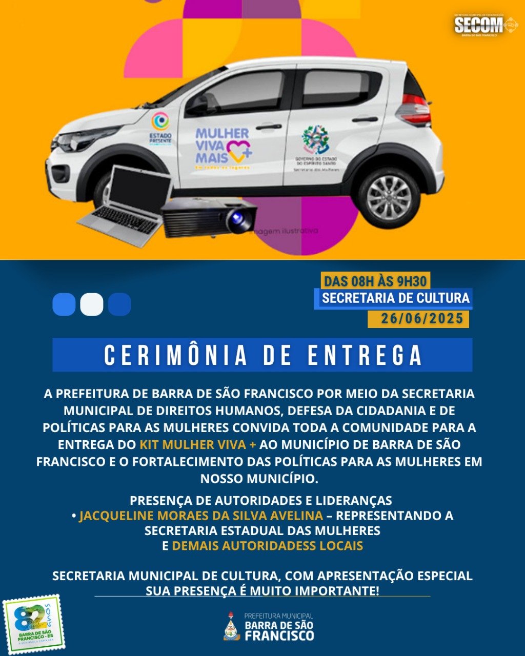 A Prefeitura de Barra de São Francisco, por meio da Secretaria Municipal de Direitos Humanos, Defesa da Cidadania e de Políticas para as Mulheres, tem a honra de convidar toda a população para a cerimônia de entrega do Kit Mulher Viva+, iniciativa do Governo do Estado do Espírito Santo que fortalece as políticas públicas voltadas à promoção da igualdade de gênero e ao enfrentamento à violência contra meninas e mulheres.