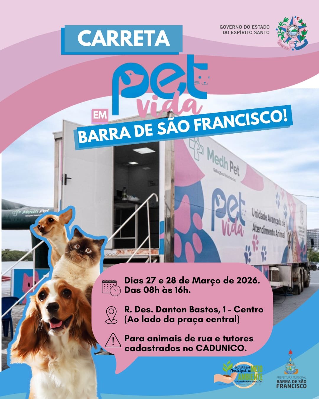 Barra de São Francisco, no Noroeste do Espírito Santo, receberá nos dias 27 e 28 de março de 2026 a Carreta Pet Vida, uma unidade móvel de atendimento veterinário que oferecerá serviços gratuitos para animais. A ação será realizada das 8h às 16h, na Rua Desembargador Danton Bastos, nº 1, no Centro, ao lado da praça central da cidade.