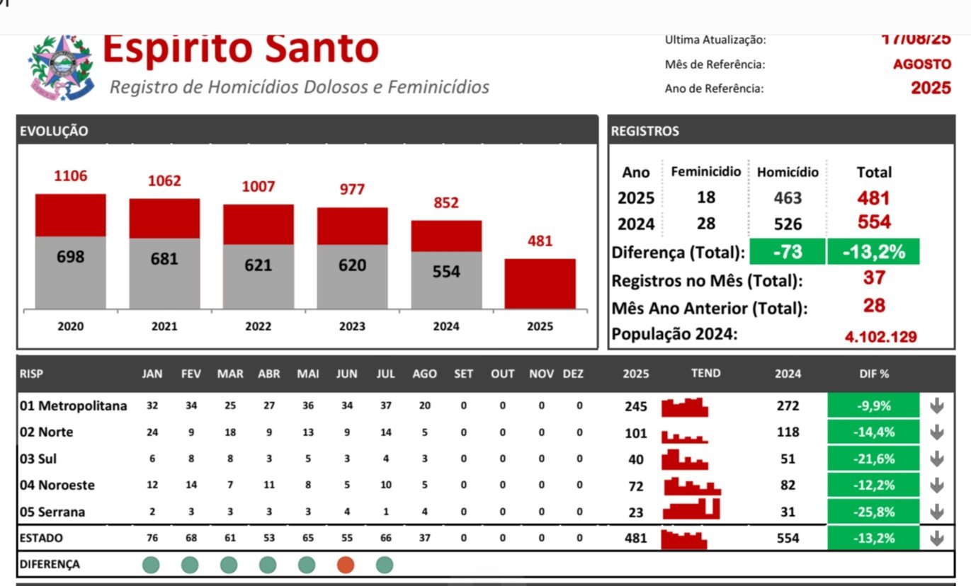Até este momento, Cachoeiro tem nove homicídios no ano, redução de 43,7% em relação ao mesmo período de 2024. A projeção para o ano é de 7,2 homicídios por grupos de 100 mil habitantes.