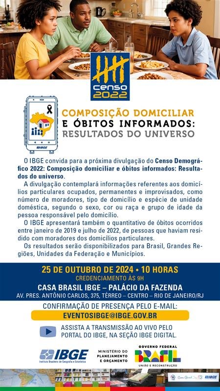 No dia 25 de Outubro, às 10h, o Instituto Brasileiro de Geografia e Estatística (IBGE) divulgará os resultados do Censo Demográfico 2022: Composição domiciliar e óbitos informados: Resultados do Universo. O evento será na Casa Brasil IBGE, no térreo do Palácio da Fazenda, localizado no Centro do Rio de Janeiro (RJ). E será transmitido pelo IBGE digital e redes sociais do Instituto.