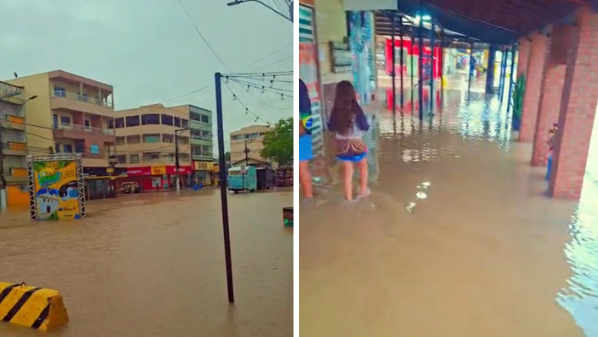 Ruas do balneário de Guriri, em São Mateus, ficaram alagadas nesta quarta-feira (21), durante as chuvas que atingiram a região Norte do Espírito Santo.
