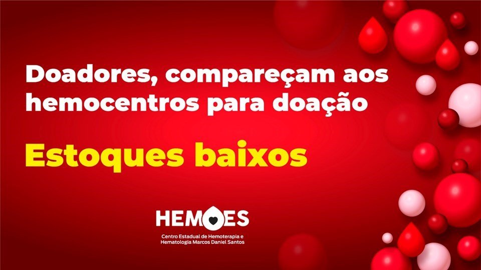 “Apelamos para que os doadores antecipem as doações, considerando os feriados, que vão comprometer os estoques existentes, principalmente o de plaquetas. É uma oportunidade também para que novos doadores nos ajudem a abastecer a hemorrede nesse período”, reforçou a diretora-geral do Hemoes, Marcela Murad.