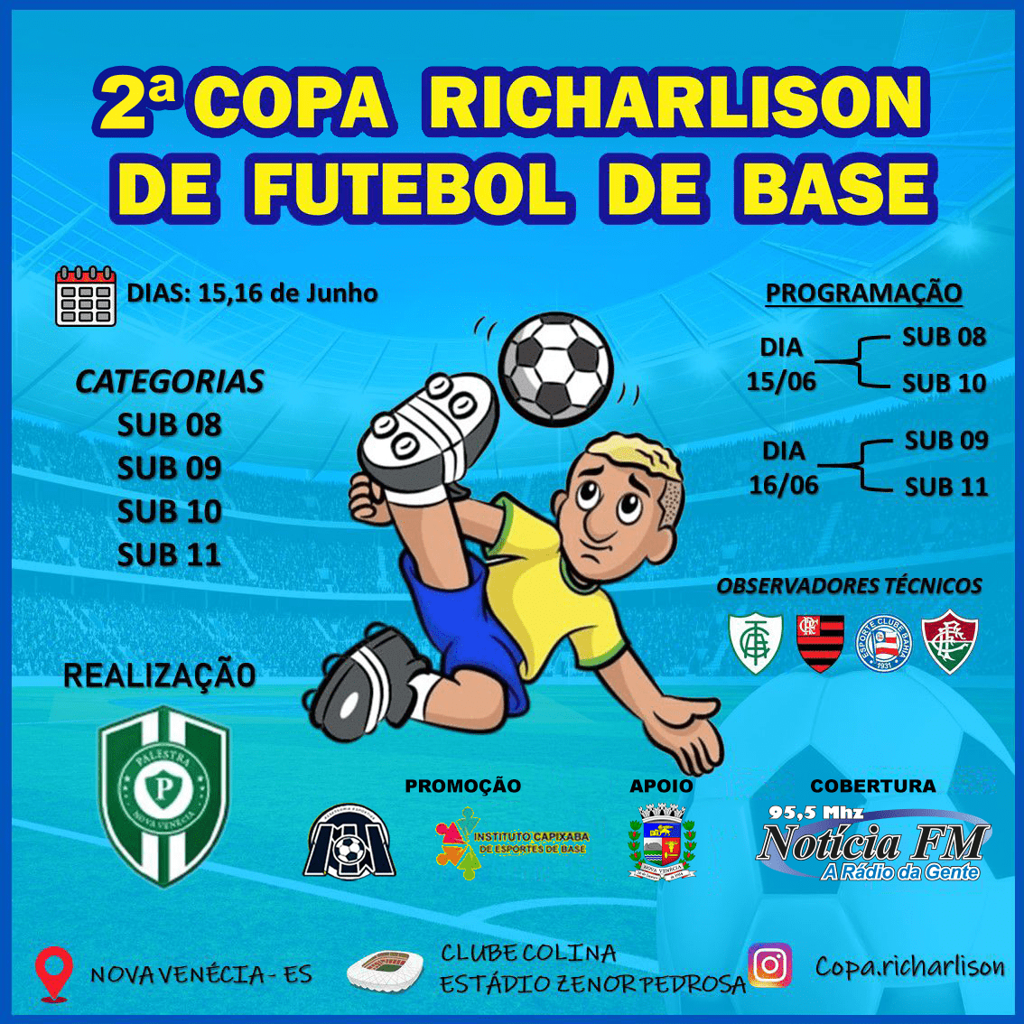 Acontece nos próximos dias 15 e 16, a 2ª edição da Copa Richarlison de Futebol de Base. A competição vai contar com 48 equipes, nas categorias sub 08, sub 09, sub 10 e sub 11.