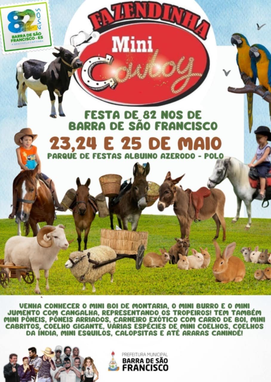 Estará acontecendo em Barra de São Francisco, de 23 a 25 de maio, a comemoração de seus 82 anos e quem ganha o presente são as crianças com a Fazendinha Mini Cowboy, no Parque de Festas Albuíno Azeredo, no Polo Industrial.