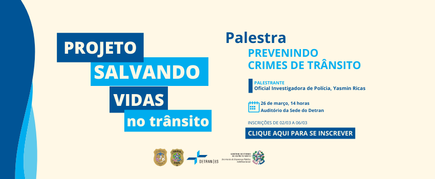 Com o objetivo de prevenir sinistros de trânsito e preservar vidas, o Departamento Estadual de Trânsito do Espírito Santo (Detran|ES) disponibilizará para o público geral a palestra “Prevenindo Crimes de Trânsito”. Será no dia 26 de março, às 14h, no auditório da Sede do Detran|ES, em Vitória. As inscrições podem ser feitas entre esta segunda-feira (02) e a sexta-feira (06) no site www.detran.es.gov.br.