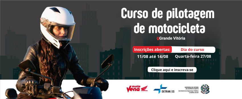 O Departamento Estadual de Trânsito do Espírito Santo (Detran) abre novas vagas para o curso de pilotagem de motocicleta, para condutores já habilitados na categoria “A”. O curso é gratuito e as inscrições começam nesta segunda-feira (11) e seguem até quinta-feira (14). O interessado deve acessar a página de inscrições no banner no site www.detran.es.gov.br.