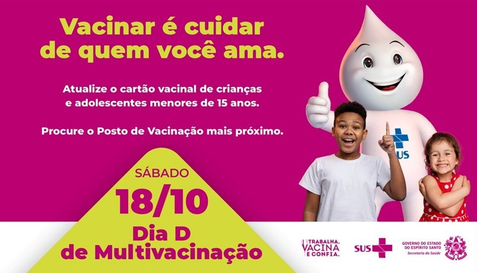 Neste sábado (18), os municípios capixabas participam do Dia D de mobilização da Campanha de Multivacinação. A ação é nacional, em parceria com os estados e municípios, e visa, além de atualizar a caderneta vacinal de crianças e adolescentes menores de 15 anos, ofertar o serviço de vacinação de forma a ampliar o acesso à população.