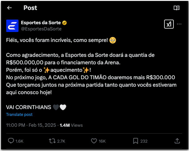 Esta não é a 1ª vez que a Esportes da Sorte faz uma doação. No sábado (15.fev.2025), depois do jogo entre Corinthians e Portuguesa, a empresa já havia doado R$ 500 mil para a vaquinha, tornando-se a maior doadora da campanha até o momento.