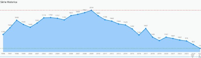 A partir daí, o Estado registra cinco anos de quedas consecutivas. A tendência é fechar2025 com redução de 28,27% em relação a 2020.