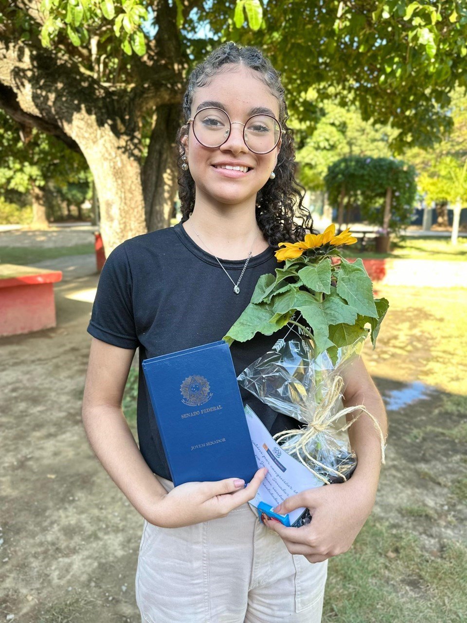 O anúncio da premiação foi feito na última quinta-feira (26), durante uma cerimônia realizada no auditório da escola. Em meio a aplausos de colegas, professores, familiares e representantes da Secretaria da Educação (Sedu), a estudante recebeu um passaporte simbólico, entregue pela gerente de Currículo da Educação Básica, Aleide Cristina de Camargo, e pelo coordenador estadual do Programa Jovem Senador, Danilo Fernandes Sampaio de Souza.