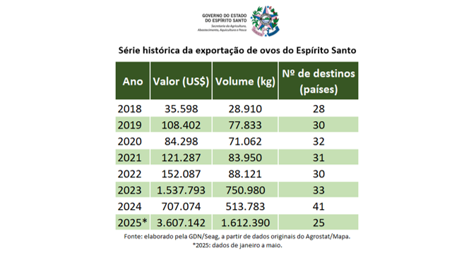 Nos primeiros cinco meses de 2025, o Espírito Santo registrou um novo recorde nas exportações de ovos, com US$ 3.607.142 em valor comercializado e um volume embarcado de 1,6 mil toneladas. O desempenho obtido de janeiro a maio já supera todo o acumulado da série histórica. Os dados foram apurados pela Gerência de Dados e Análises da Secretaria da Agricultura, Abastecimento, Aquicultura e Pesca (Seag).