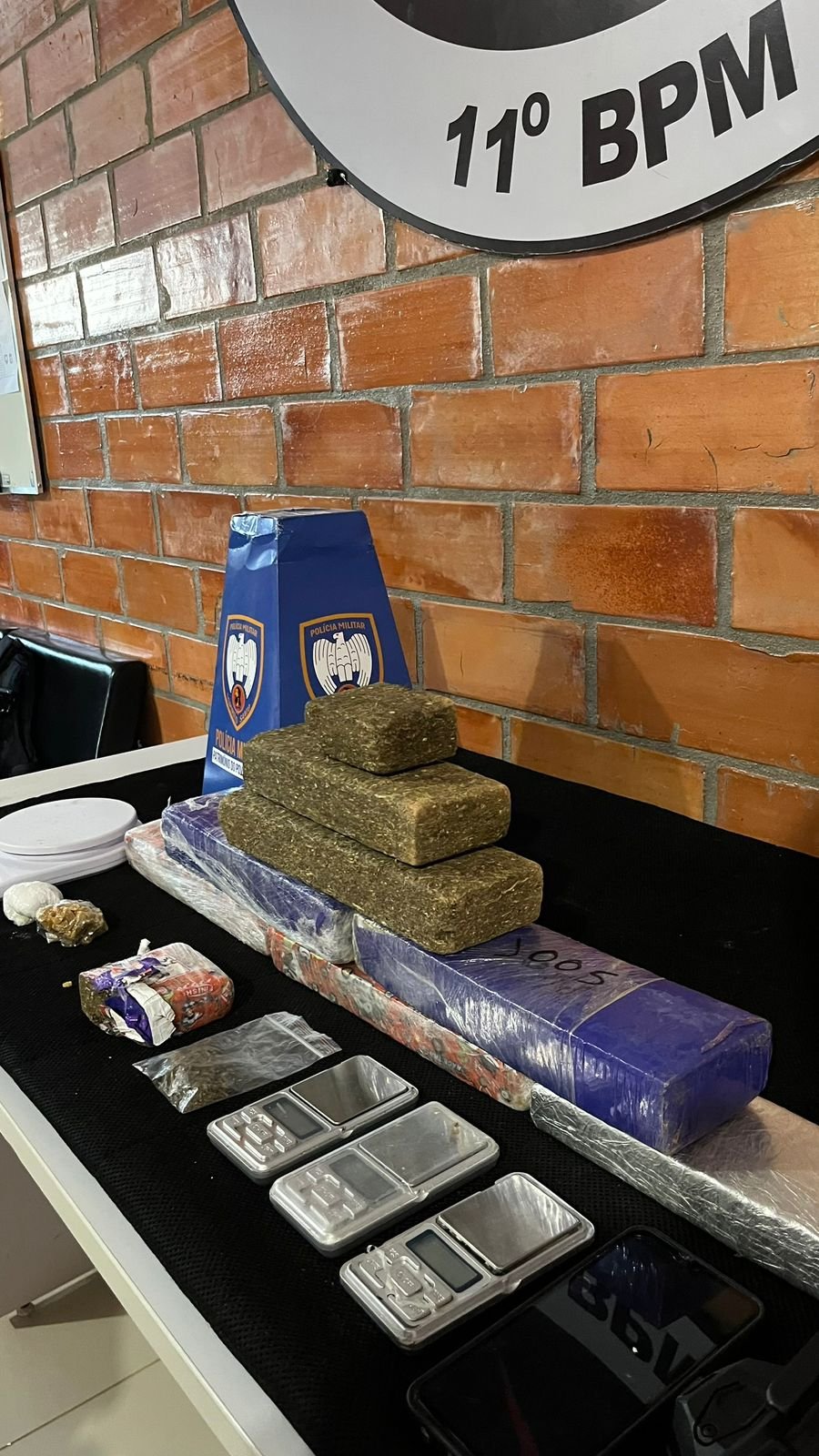Ao todo, foram apreendidos aproximadamente 5,556 quilos de maconha, 25 gramas de cocaína, 44 gramas de crack, além de uma porção adicional de maconha, cinco balanças de precisão, um aparelho celular, um rádio comunicador e um coldre.
