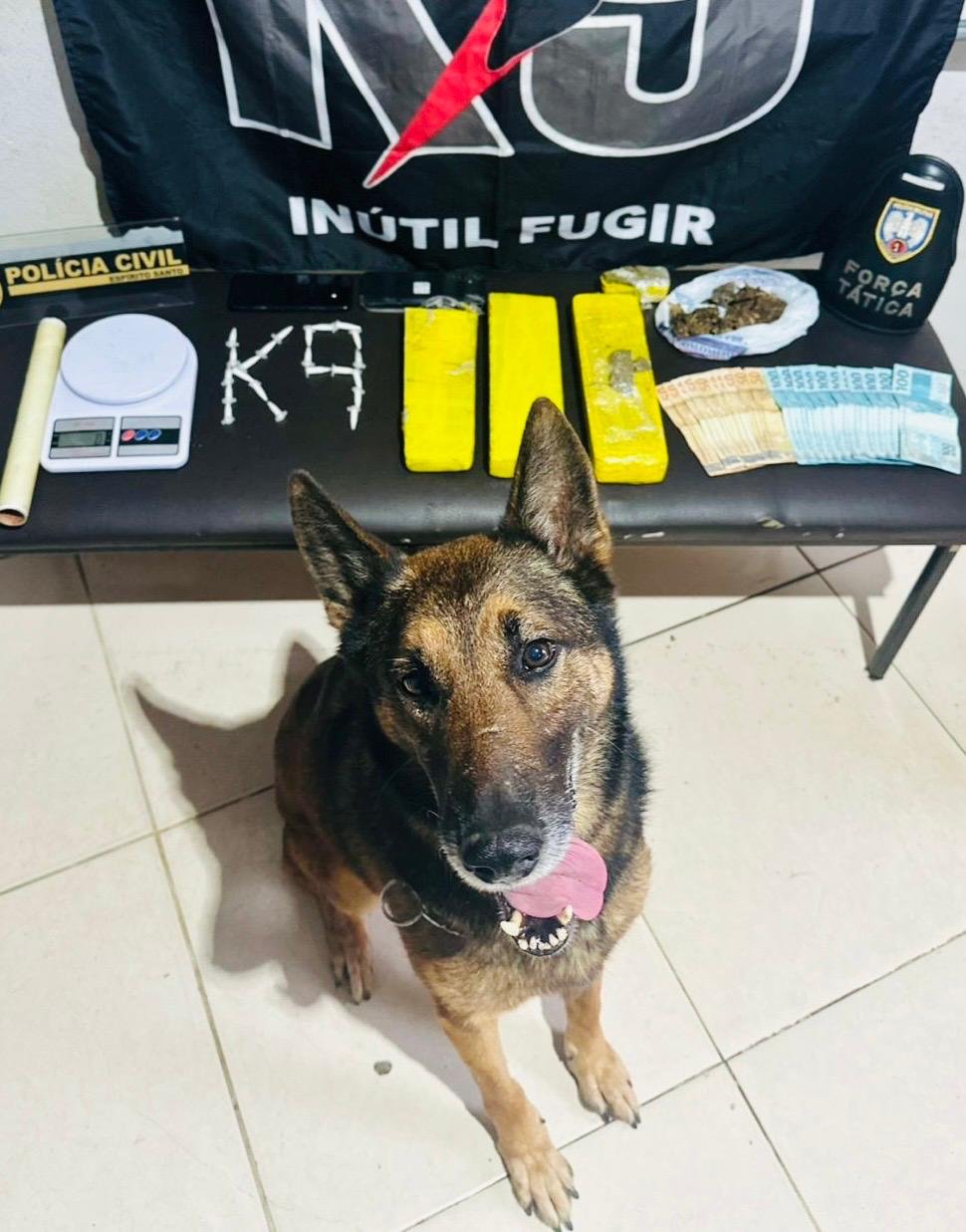 A ação foi desencadeada para o cumprimento de um mandado de busca e apreensão expedido pela Justiça. Durante as buscas no imóvel, as equipes policiais, com o auxílio fundamental de um cão farejador da equipe K9 da PMES, localizaram e apreenderam: