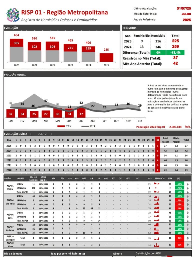 O outro foi em Balneário Carapebus, na Serra, que escalou no último mês,  saindo de quatro homicídios em junho para 14 em julho, um aumento de 250% de um mês para o outro. No ano, porém, Serra tem-28% em relações aos sete primeiros meses de 2024. (Da Redação)