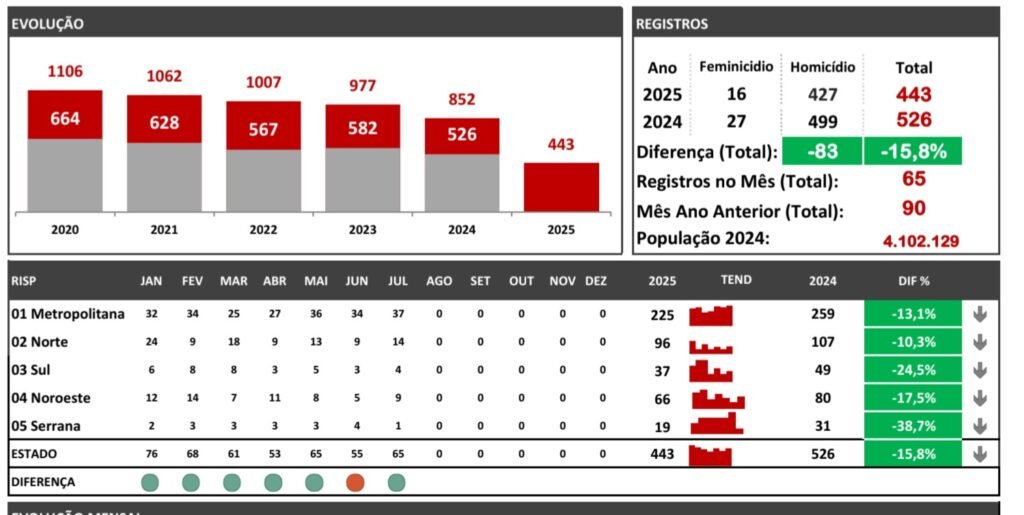 Quando comparado com julho de 2024, o mês passado teve redução de -27,8% no número de homicídios – foram 65 em 2025 ante 90 de julho de 2024.