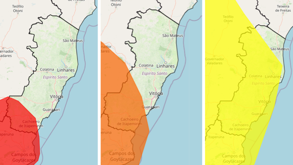 O Instituto Nacional de Meteorologia (Inmet) emitiu três alertas para cidades do Espírito Santo nesta quarta-feira (17), indicando risco de chuva, com validade até as 10h de quinta-feira (18).