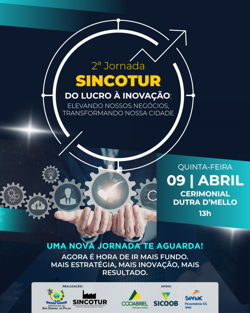A Prefeitura Municipal de São Gabriel da Palha abriu as inscrições para a 2ª Jornada Sincotur, que ocorrerá a partir das 13h do dia 9 de abril, no Cerimonial Dutra D’Mello, no município. A inscrição e a participação são gratuitas, contando com formações e palestras ministradas por especialistas.