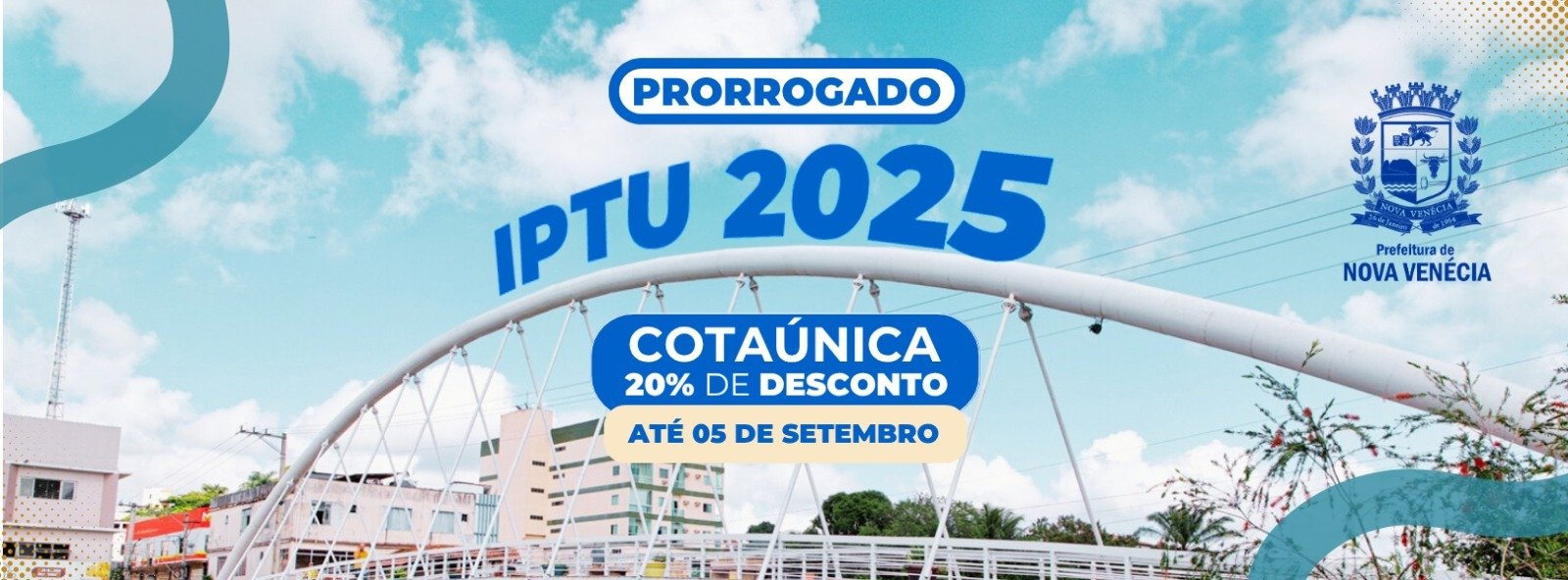 A Prefeitura de Nova Venécia informa que foi prorrogado o prazo para o pagamento em cota única do IPTU 2025 com 20% de desconto. Agora, os contribuintes têm até o dia 5 de setembro para quitar o tributo com abatimento no valor total.