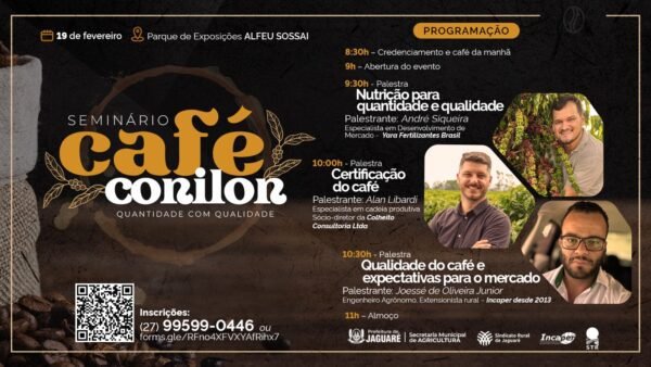 Com o aumento exponencial do preço do café no País, a Prefeitura de Jaguaré, por meio da Secretaria Municipal de Agricultura, vai realizar o 1º Seminário de Café Conilon no município, com o tema “Quantidade com Qualidade”. O evento será realizado no dia 19 de fevereiro a partir das 8h:30 no Parque de Exposições Alfeu Sossai no Bairro Boa Vista. Atualmente, Jaguaré possui 9 marcas de café especial registradas que são comercializadas fora do município possibilitando incremento na renda dos produtores, além de valorizar a cultura do café na região.