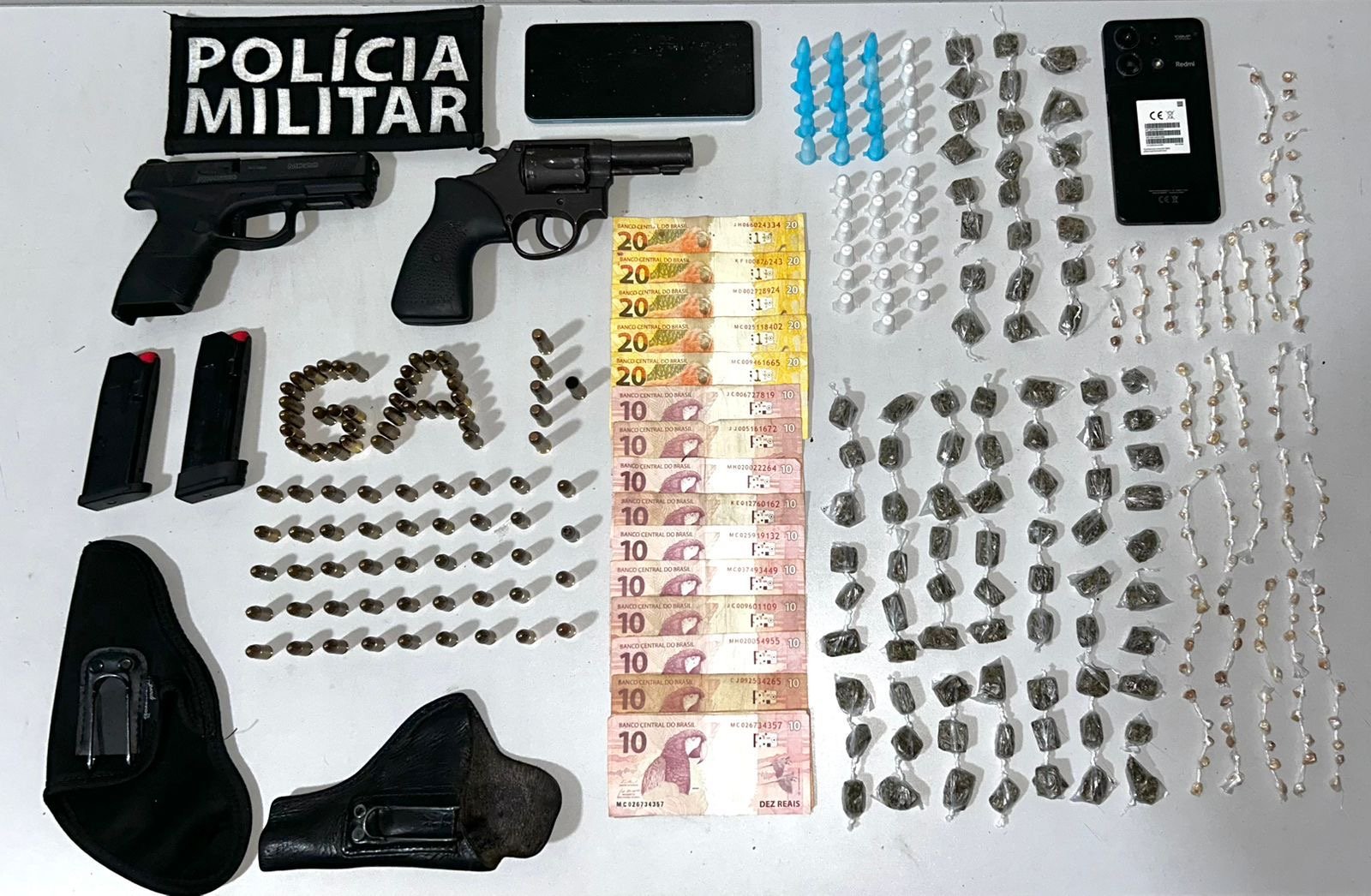A PM informou que um segundo suspeito que estava no local foi detido portando uma pistola calibre 9mm carregada com 15 munições intactas. No interior do imóvel, os policiais apreenderam um carregador com 13 munições, outras 52 munições, 87 buchas de maconha, 39 pinos de cocaína, 156 pedras de crack e R$ 240,00 em espécie.