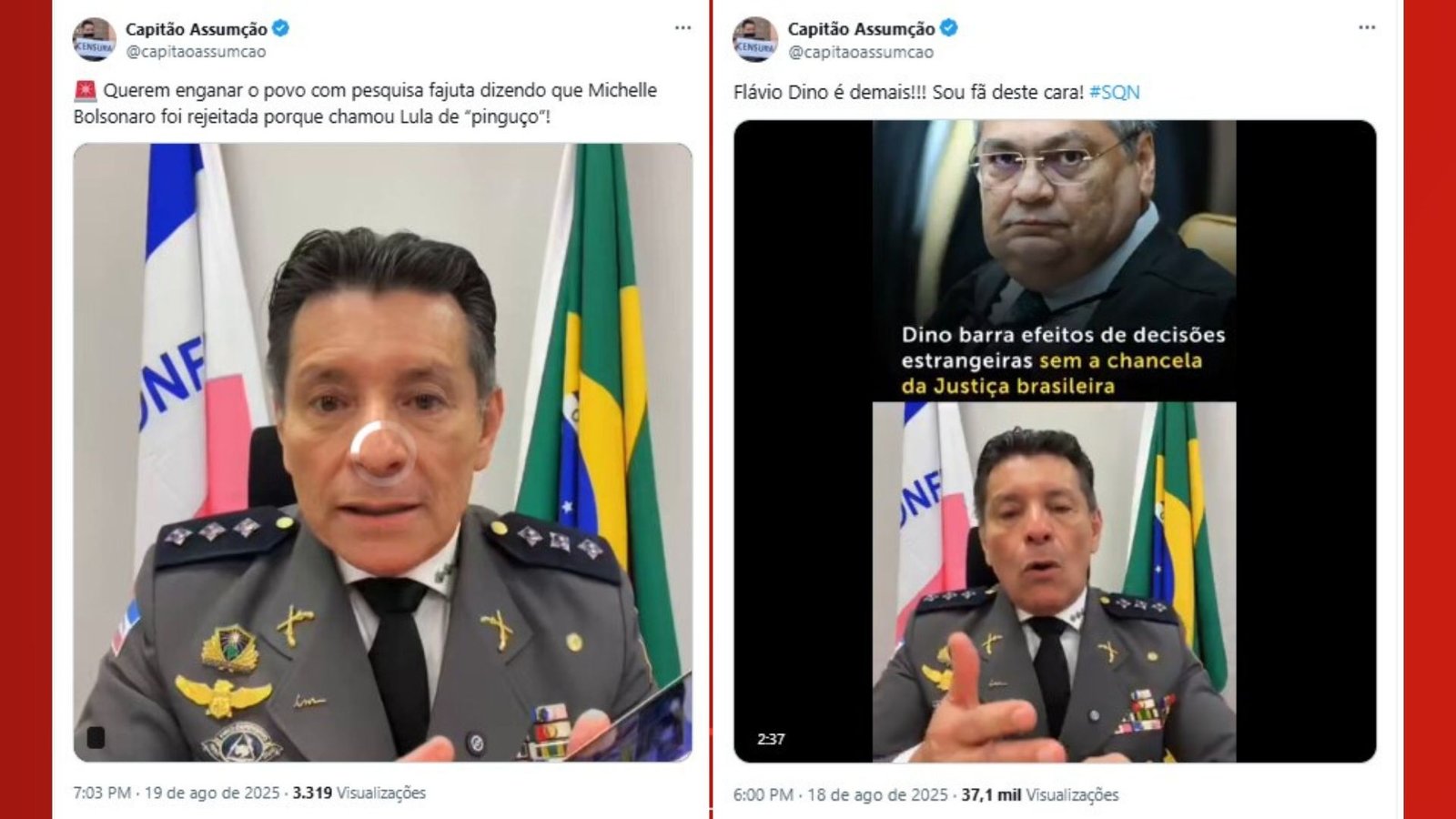 No mês de agosto, o deputado voltou a fazer publicações na rede social X. Em algumas postagens ele faz críticas a Moraes e ao também ministro do STF, Flávio Dino.