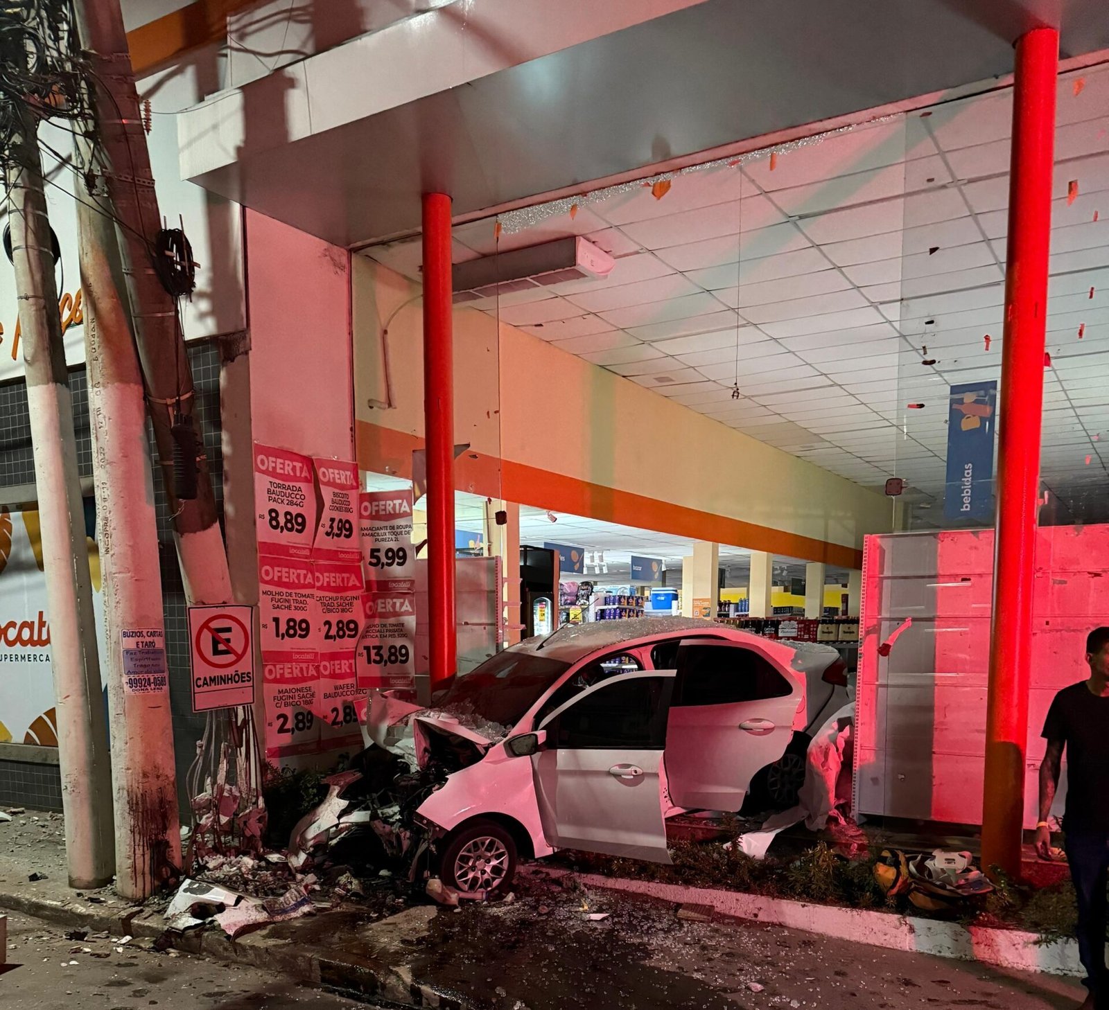 Uma mulher ficou ferida após um carro invadir o Supermercado Locatelli, na Avenida Silvio Avidos, bairro São Silvano, em Colatina, no Noroeste do Espírito Santo. O acidente ocorreu por volta de 1h40 da madrugada desta segunda-feira (21). Segundo o boletim da Polícia Militar, o veículo Ford Ka, de cor branca, colidiu com um poste e, em seguida, com a fachada do estabelecimento, quebrando os vidros e parando parcialmente dentro do imóvel.