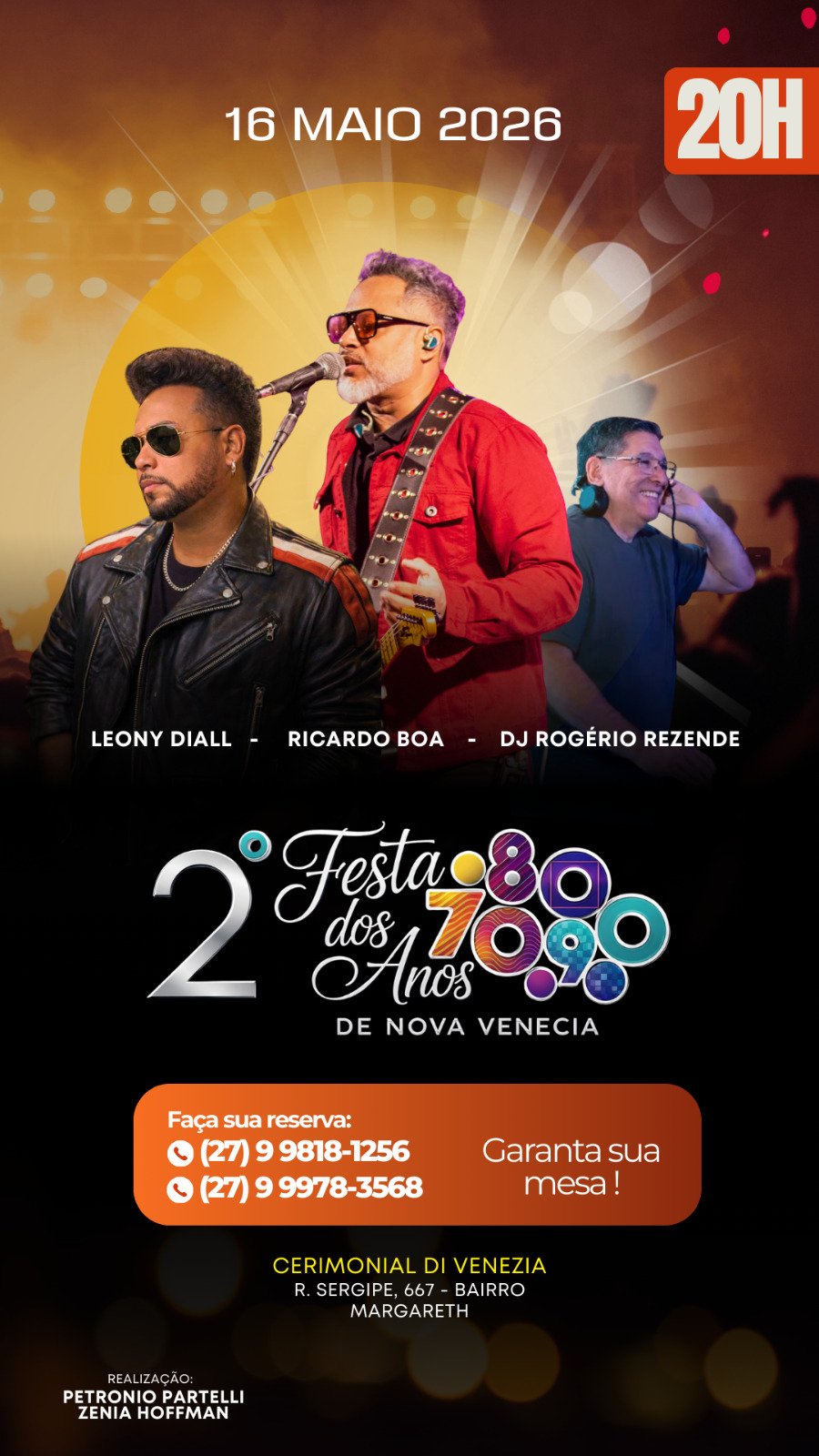 Os interessados já podem garantir suas reservas antecipadamente pelos telefones (27) 99818-1256 e (27) 99978-3568. A festa, organizada por Petronio Partelli e Zenia Hoffman, promete entregar uma noite inesquecível para quem deseja reviver grandes momentos da música e da vida social da cidade.