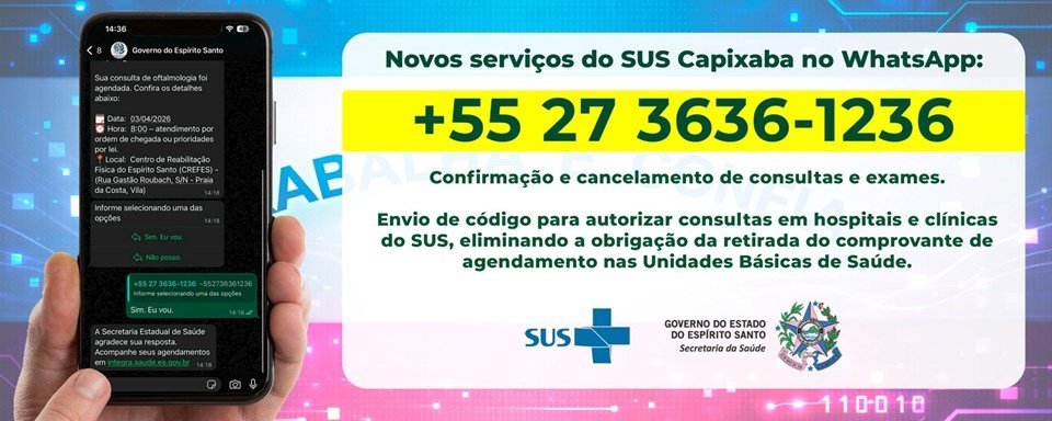 Agora, o novo sistema de avisos da Sesa pelo WhatsApp (27) 3636-1236 vai enviar mensagens, a partir deste mês, aos pacientes do SUS, confirmando a identidade deles e avisando sobre as consultas e exames. Caso confirmem presença, eles receberão informações dos agendamentos e um código de liberação das consultas.