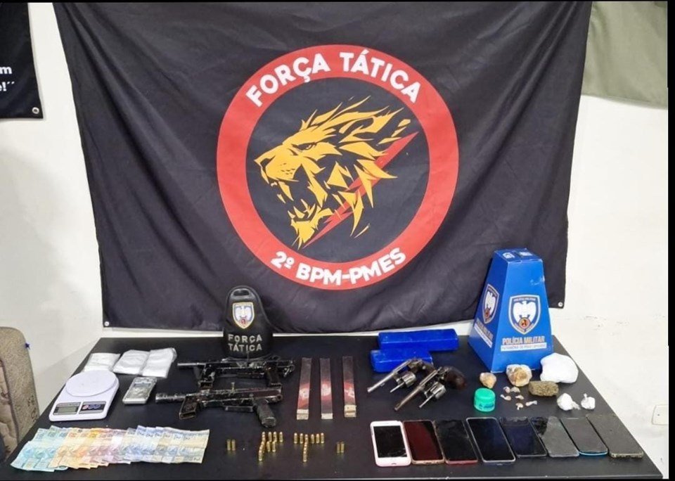 Na tarde de segunda-feira (26), equipes da Força Tática do 2º Batalhão realizaram uma operação na zona rural de Nova Venécia que resultou em uma expressiva apreensão de drogas, quatro armas de fogo — entre elas, duas submetralhadoras —, 23 munições intactas, grande quantia em dinheiro, aparelhos celulares e na condução de quatro indivíduos ligados a facção criminosa para o Departamento de Polícia Judiciária (DPJ) do município.