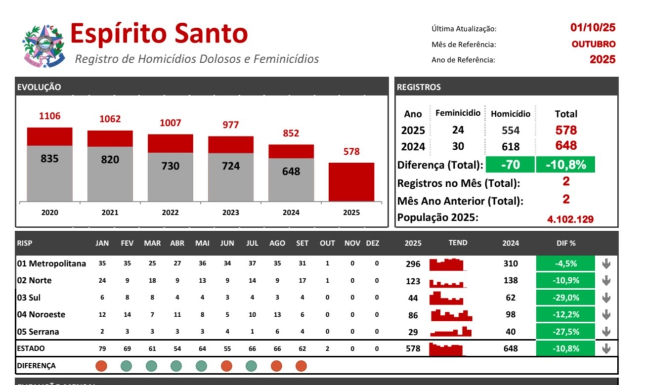 Neste ano, o Estado tem, até o momento, 70 homicídios menos do que no mesmo período de 2024. A redução é de 10,8% em 274 dias do ano.