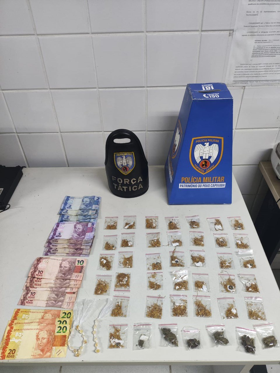 No interior da sacola foram encontradas e apreendidas 36 unidades de haxixe (15g), 18 pedras de crack (5g), 06 buchas de skank (5g), além de R$ 163,00 em espécie. O suspeito não foi localizado.