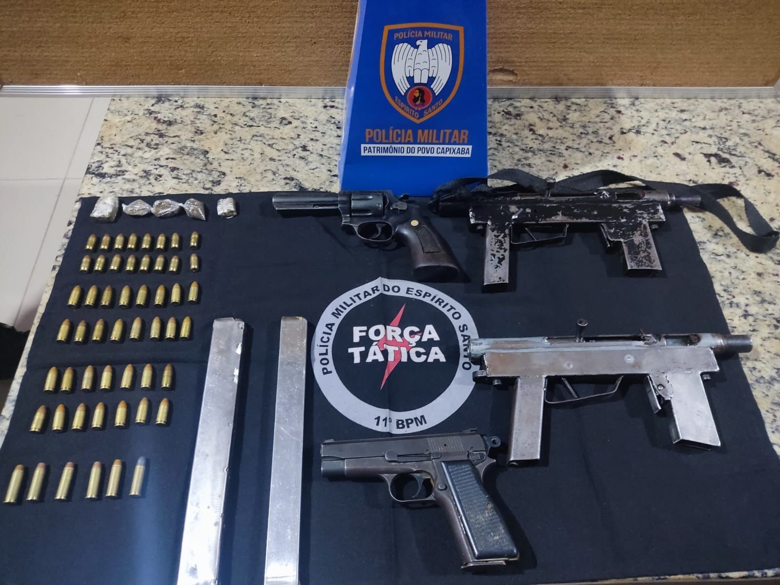 Durante o patrulhamento a pé, os policiais localizaram os suspeitos que tentaram fugir, mas foram rapidamente detidos. Na abordagem, foram encontradas duas submetralhadoras calibre 9mm de fabricação semi-industrial, uma pistola calibre 9mm, um revólver calibre .38, carregadores e munições de diversos calibres, além de cinco buchas de maconha e uma balança de precisão.