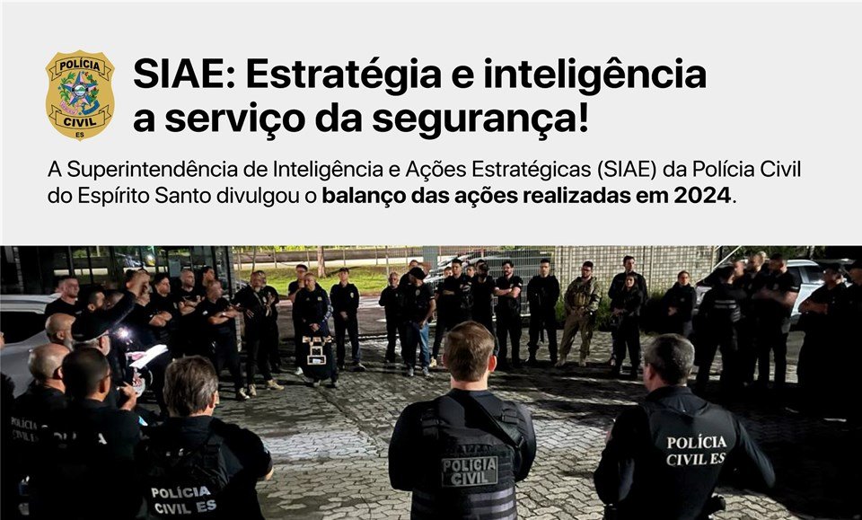 A Polícia Civil do Espírito Santo (PCES), por meio da Superintendência de Inteligência e Ações Estratégicas (SIAE), divulgou, nesta quinta-feira (20), o balanço das atividades desenvolvidas ao longo de 2024. Durante o ano, foram realizadas diversas ações em apoio à Superintendência de Polícia Regional Metropolitana (SPRM).