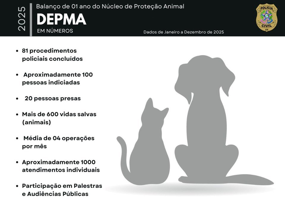 A Polícia Civil do Espírito Santo (PCES), por meio do Núcleo de Proteção Animal da Delegacia Especializada de Proteção ao Meio Ambiente (DEPMA), apresenta o balanço de um ano de atuação dedicado à defesa da vida, ao combate aos crimes de maus-tratos e à promoção do bem-estar animal no Espírito Santo.