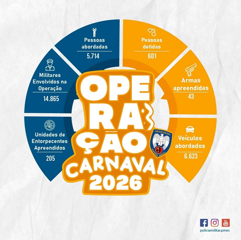 A Polícia Militar divulga os resultados da Operação Carnaval 2026, realizada entre os dias 06 e 18 de fevereiro, nos municípios capixabas. A ação teve como objetivo promover a paz social, preservar a ordem pública e ampliar a sensação de segurança da população durante o período festivo no Espírito Santo.