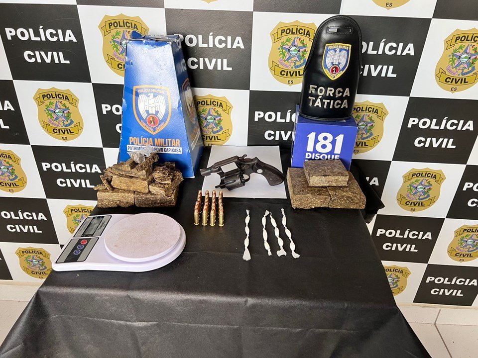 Durante buscas no imóvel dos investigados, foram encontrados um revólver calibre .38, 18 munições, uma balança de precisão, câmeras de videomonitoramento, além de uma motocicleta Honda CG Titan, sem placas de identificação, utilizada no tráfico de drogas.