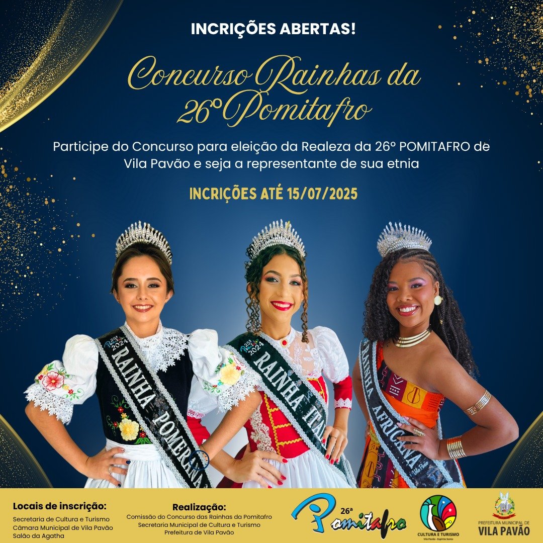 A 26ª edição da Pomitafro, considerada o maior evento étnico-cultural da região, acontecerá nos dias 29, 30 e 31 de agosto de 2025 no Parque de Festas de Vila Pavão, celebrando a integração e a vibrante herança pomerana, italiana e africana que molda a identidade do município. O concurso de Rainhas é um dos pontos altos desta celebração da diversidade.